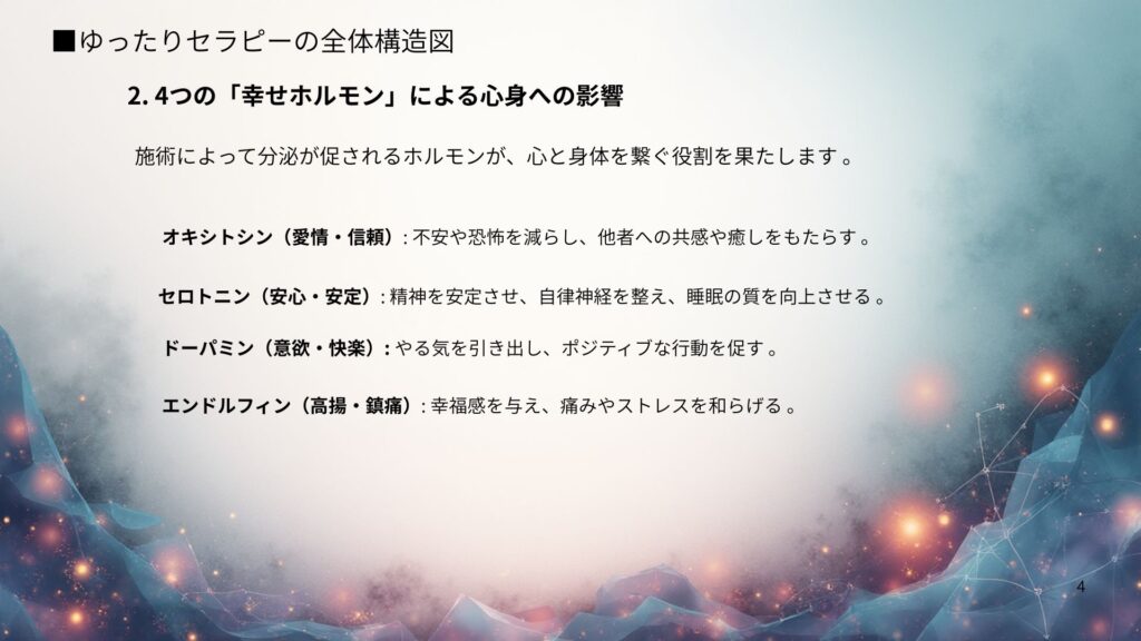 ゆったりセラピーとは何か、ということを考える時に体内で分泌される「ホルモン」から見ていくことができます。「ホルモン」は、心と身体をつなぐ物質とも言えます。特に神経伝達物質として脳内で分泌される4つの「幸せホルモン」を見ていきましょう。