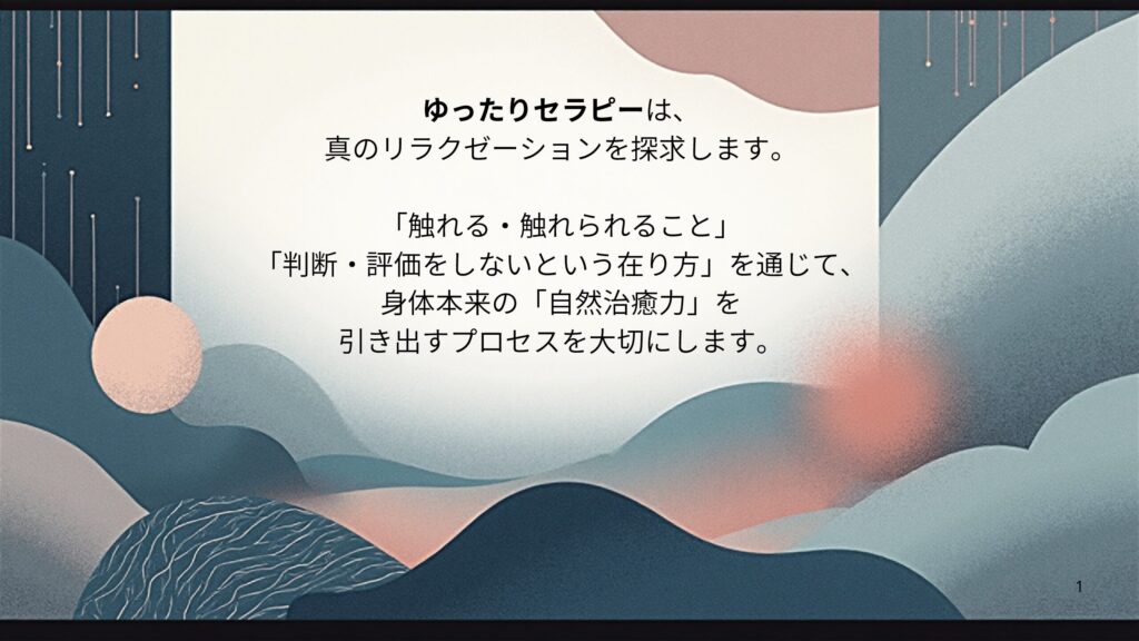 日々の生活の中で置き去りにしがちな自身の心とカラダを、ふっとゆるませ、ゆったりとした感覚や気持ち、カラダ本来のやわらぎや伸びやかさを取り戻すために、ゆったりセラピーは作られました。