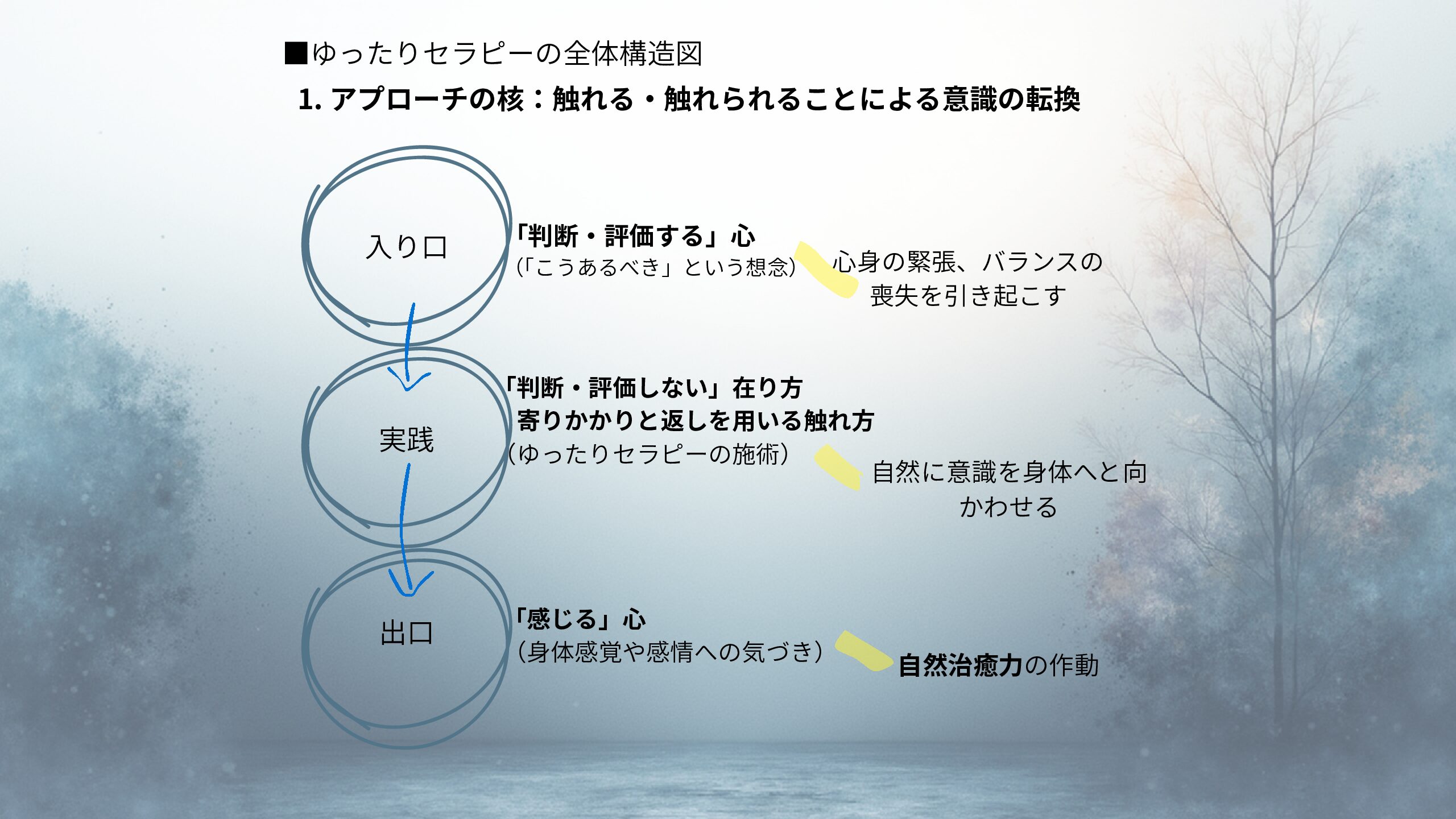 ゆったりセラピストは、「判断・評価をしない」ということがどういうことなのか、またそれが、どのような心身の在り方をもたらすのかを学びます。 ゆったりセラピーの「触れる」ということ、そして施術は、「判断・評価をしない」で、カラダに意識を向ける、ということのために行います。触れられると、私たちは必ず、そこに意識が向きます。否が応にも向いてしまう、私たちの心身はそういう性質を持っています。