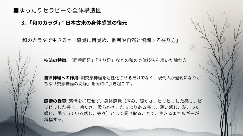 ゆったりセラピーのゆっくりとした触れ方、また”和のカラダ”の使い方で触れられること、この双方が、交感神経を沈静へと導きます。
